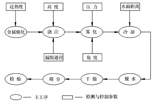 水霧化制粉方法制取金屬粉末工藝:首先金屬或合金在感應爐中熔化、精煉,熔化的金屬液體倒入保溫坩堝,金屬液順導流管流下的過程中,超高壓水流通過噴嘴將金屬液體破碎成大量細小的金屬液滴,細小的液滴在飛行過程中在表面張力和水的快速冷卻共同作用下形成亞球形或不規則形顆粒,霧化后的金屬顆粒在霧化塔中進行凝固、沉降、后落入收粉罐中收集、分離。而且,通過調整制粉工藝過程中的不同參數,能夠獲得各種粒度分布及形貌的金屬粉末,從而更好地滿足機械制造、汽車工業、航空航天以及金屬注射成型、摩擦材料、含油軸承、結構零件、金剛石工具等諸多粉末冶金領域的廣泛需求。